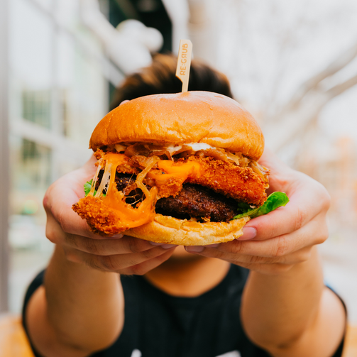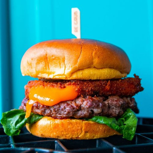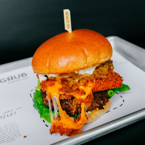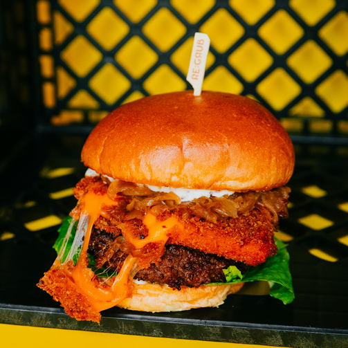 Alberta Beef Brisket Patty served with Deep-Fried Cheddar Cheese Block, Lettuce, Tomato, Caramelized Onions, Creamy Bacon Ranch